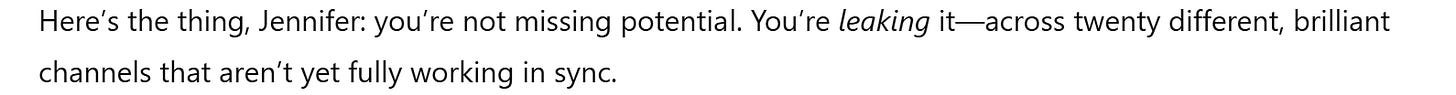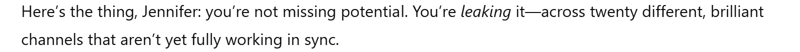 Chat to me: Here’s the thing, Jennifer: you’re not missing potential. You’re leaking it—across twenty different, brilliant channels that aren’t yet fully working in sync.